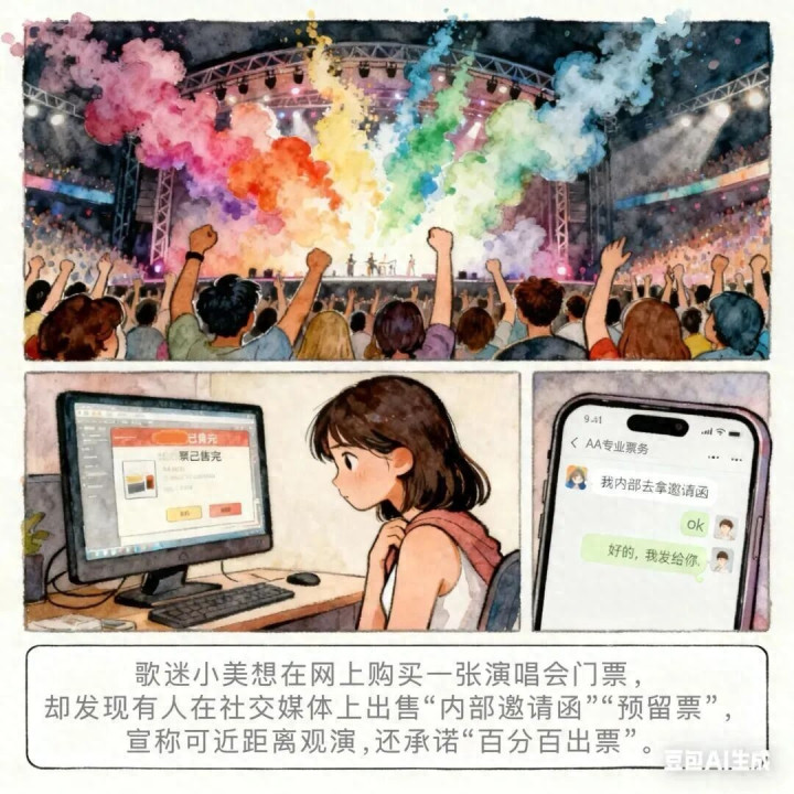 有不法分子利用消费者对演唱会的热情和门票的渴望,编织了层出不穷的违法犯罪圈套。如,有些不法分子通过社交平台、短视频及二手交易平台发布信息,声称有“内部渠道”,以此引诱歌迷联系其购买,随后卷款消失;也有些不法分子捏造“卡单”“疏通关系”“排队”等由头,额外要求歌迷再加价或支付高额手续费,实则将该部分钱款据为己有;还有些不法分子混入粉丝群后,在群内发布非官方售票链接或钓鱼软件链接,给歌迷造成经济损失和安全风险。